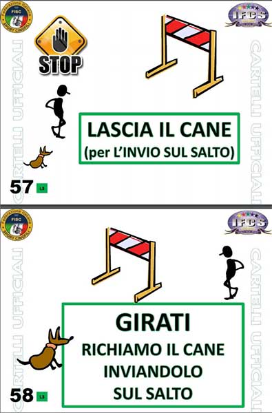 Oppure l’esercizio STOP-LASCIA IL CANE PER L’INVIO SUL SALTO+GIRATI-RICHIAMA IL CANE INVIANDOLO SUL SALTO, dove il conduttore si ferma e il cane si siede al piede, quindi il conduttore raggiunge il cartello successivo, si gira e chiama il cane facendogli superare il salto che non si trova di fronte a sé ma fuori linea, il cane arriva di fronte al conduttore, assume la posizione al piede o al posto e il binomio prosegue verso il cartello successivo. In questo esercizio ci sono due difficoltà in più: la prima riguarda la posizione del salto, in quanto il cane per arrivare dal conduttore deve fare una deviazione sul salto che è posizionato fuori linea rispetto a lui e al conduttore, la seconda riguarda il conduttore, il quale per il richiamo del cane sul salto può utilizzare un comando verbale e gestuale purché eseguiti contemporaneamente (regola che ha validità per tutti gli esercizi) ma senza spostare i piedi che invece dovranno restare vicini fra loro.