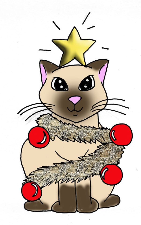 Faccio appena in tempo ad accorrere che gatto, albero, decorazioni e tutto mi precipitano tra le braccia; le decorazioni di vetro si schiantano in terra e il tutto si trasforma in un informe ammasso da districare.