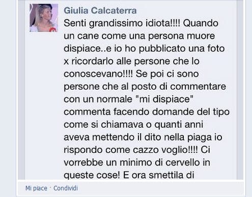Ho risposto così ad almeno una ventina di lettori che mi chiedevano di dire qualcosa a proposito della nuova “velina” bionda, Giulia Calcaterra, della quale si dice che abbia “maltrattato” il suo rottweiler. Poiché, però, mi stanno arrivando sempre nuove richieste…okay, due parole ce le spendo. E ce le spendo anche perché c’è un’altra cosa che mi ha fatto girare le palle a elica: ‘sta storia del cane sta impazzando su FB già da diversi giorni, ma non se l’è filata nessuno. Ora che invece sono uscite anche delle foto in cui la Calcaterra ha posato nuda, ecco che se ne occupano il Corriere e Oggi , con due titoli che danno decisamente più importanza alle “foto hot” che al presunto maltrattamento del cane.