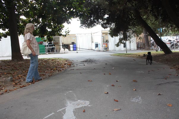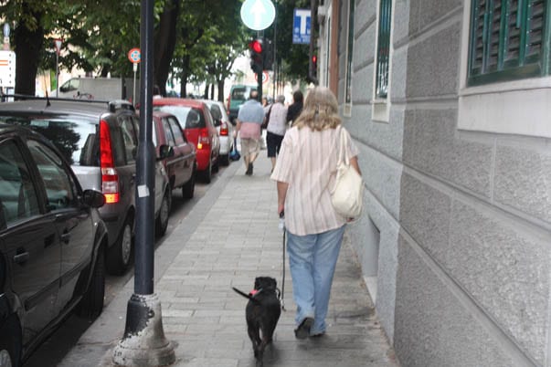 Nella foto sotto ho simulato la classica situazione “Sciuramaria da una parte della strada e cane dall’altra”, che purtroppo ho visto più volte dal vivo e non con in mezzo il vialetto di un parco, ma una strada trafficata.