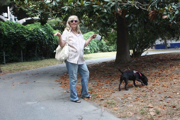 Valeria Rossi che porta in giro un cane con la pettorina.